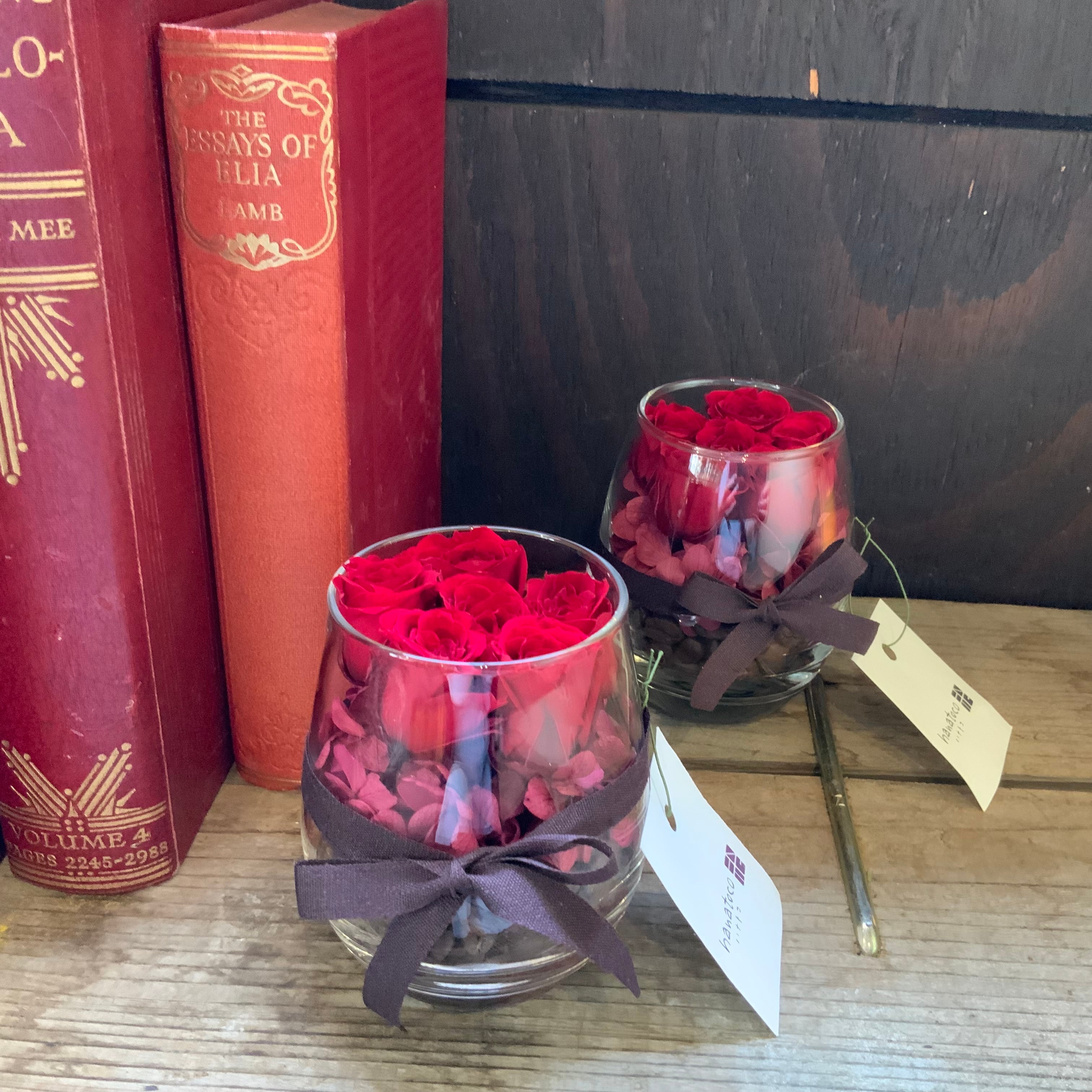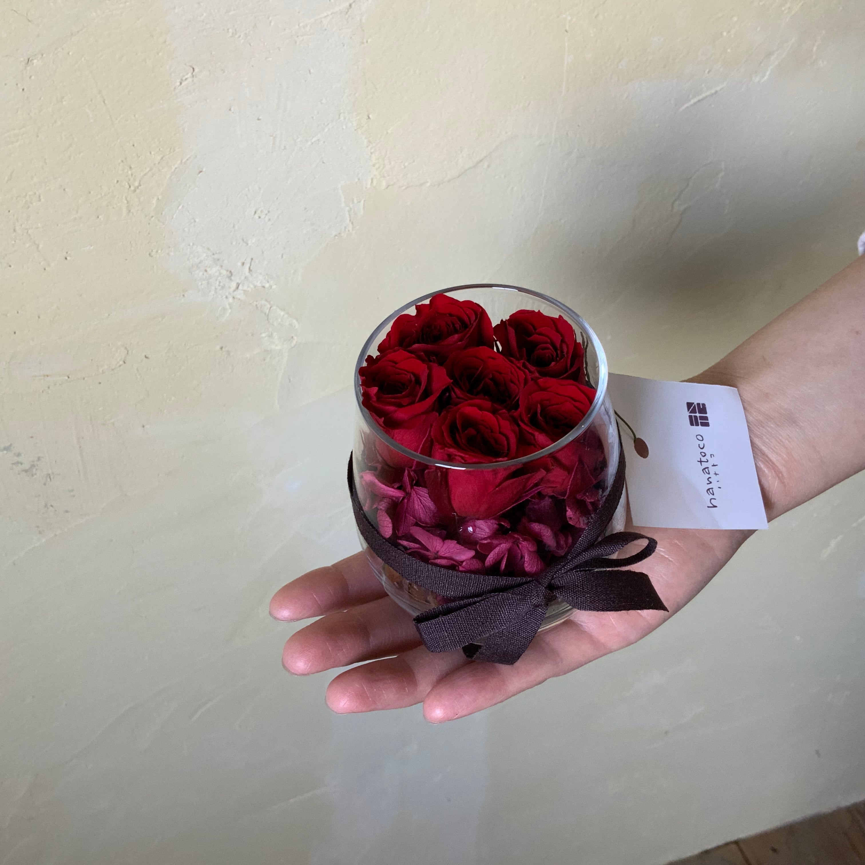 人気のプリザーブドフラワーをガラスの中につめ込んだ手のひらサイズのアレンジメントです。